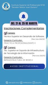 Novedades Institucionales Inscripciones Complementarias Publicado por Biblioteca el agosto 21, 2025 Biblioteca Read Next → Novedades Institucionales Mesas de Examen P.E.E Novedades Institucionales Mesas de Examen- P.E.T. Novedades Institucionales Mesas de Examen-T.S.S.I.T.I